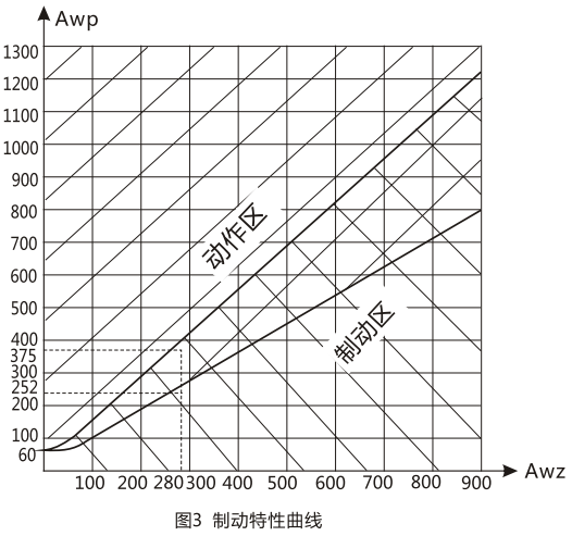 4.由動作電流與制動電流的比值所決定的制動系數(shù)Kz可以在廣泛的范圍內(nèi)變化,圖3的制動特性AWp=f(AWz)是其極限范圍,它與工作電流濟口制動電流間的相位角有關(guān),但無論在任何角下都不應(yīng)越出曲線的范圍,,5.可靠系數(shù)(當(dāng)一次動作電流等于5IDz的繼電器正弦動作電流與當(dāng)一次動作電流等于5IDZ的正弦動作電流的比值)不小于1.35。