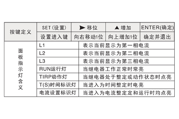 , 無數(shù)值顯示。繼電器達到所設(shè)定值,動作后,由TIRP動作燈會點亮,實際線路電流低于或高于所設(shè)定的返回值,指示燈切換回來。正常運行情況下,RUN運行燈、電流設(shè)置表示燈常亮。L1、L2、L3來回切換運行。當(dāng)輸入電流任意一相滿足動作條件,繼電器動作,電流標(biāo)識燈熄滅,表示延時時間已到動作。當(dāng)輸入接近動作條件時,繼電器進入動作預(yù)備狀態(tài),所有芯片資源用來計算輸入值,一旦滿足條件,立即啟動計時,繼電器設(shè)有啟動量連續(xù)判斷功能和突變量連續(xù)判斷功能,能夠有效迅速的判斷輸入值,并躲過短時干擾。