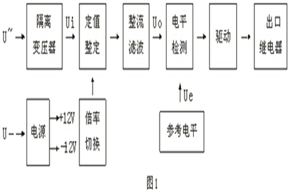 本繼電器為靜態(tài)型繼電器,采用進(jìn)口集成電路構(gòu)成,被測量的交流電壓U~經(jīng)隔離變壓器降壓后得到與被測電壓成正比的電壓Ui,經(jīng)整定后進(jìn)行整流,整流后脈沖電壓經(jīng)濾波器濾波,得到與Ui成正比的直流電壓Uo,在電平檢測中Uo與直流參考電壓 Ue 進(jìn)行比較,若直流電壓Uo低于參考電壓,電平檢測器輸出正信號(hào),驅(qū)動(dòng)出口繼電器,則本繼電器處于動(dòng)作狀態(tài)。反之,不論是過電壓繼電器或是低電壓繼電器,若直流電壓Uo高于參考電壓 Ue,電平檢測器輸出負(fù)信號(hào),本繼電器處于不動(dòng)作狀態(tài)。