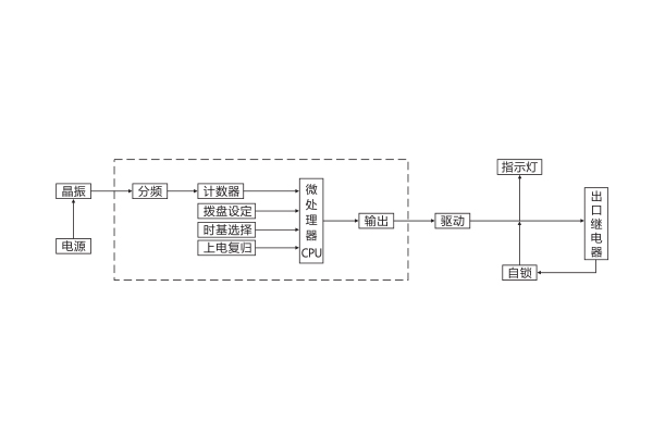 SJ-11A/11集成電路時(shí)間繼電器采用大規(guī)模CMOS專(zhuān)用集成電路。上電瞬間,晶振起振, CUP復(fù)位,從零開(kāi)始正向計(jì)數(shù),同時(shí)讀取撥盤(pán)設(shè)定值的時(shí)基常數(shù);當(dāng)計(jì)數(shù)值與設(shè)定值同時(shí),輸出高電平,驅(qū)動(dòng)三極管,出口繼電器動(dòng)作,且利用觸點(diǎn)自保持,以保證不發(fā)生抖動(dòng);當(dāng)電源消失,出口繼電器則返回,工作原理如下圖所示: