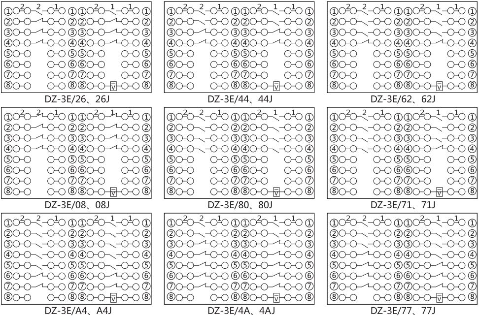 接點(diǎn)形式: 8動(dòng)合; 6動(dòng)合2動(dòng)斷; 4動(dòng)合4動(dòng)斷; 2動(dòng)合6動(dòng)斷; 8動(dòng)斷; 7動(dòng)合1動(dòng)斷; 10動(dòng)合4動(dòng)斷; 4動(dòng)合10動(dòng)斷; 7動(dòng)合7動(dòng)斷。