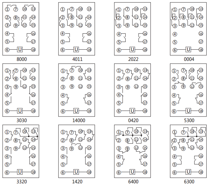注:觸點形式由4位數(shù)字組成,左起第一位表示動合觸點數(shù)量;第二位表示動斷觸點數(shù)量;第三位表示轉(zhuǎn)換觸點數(shù)量;第四位表示過渡轉(zhuǎn)換觸點數(shù)量。