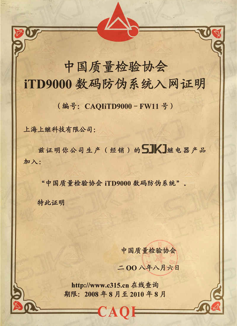 中國質(zhì)量檢驗協(xié)會iTD9000數(shù)碼防偽系統(tǒng)入網(wǎng)證明